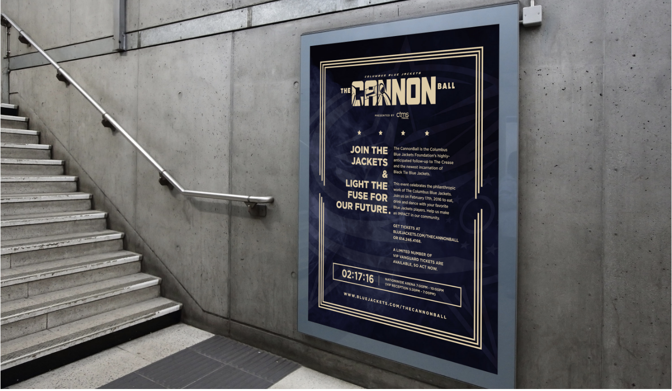 The cannonball is a fundraising event that celebrates the philanthropic work of the Columbus blue jackets. we developed the branding and visual vocabulary for this event. the cannon serves as a focal point for the arena where the blue jackets play and is a graphic element within the event logo. collateral was designed to amplify the event’s theme of “modern American bandstand”.